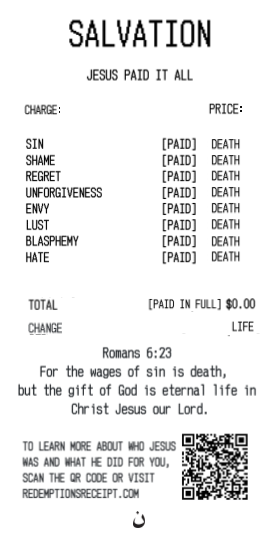 Its our joy to send out Redemption Receipt gospel tracts. If you want to join us in our mission to help spread the gospel message effectively and clearly to as many souls as possible, please place an order for as many of these free gospel tracts you are able to distribute, and spread those seeds to the world.
